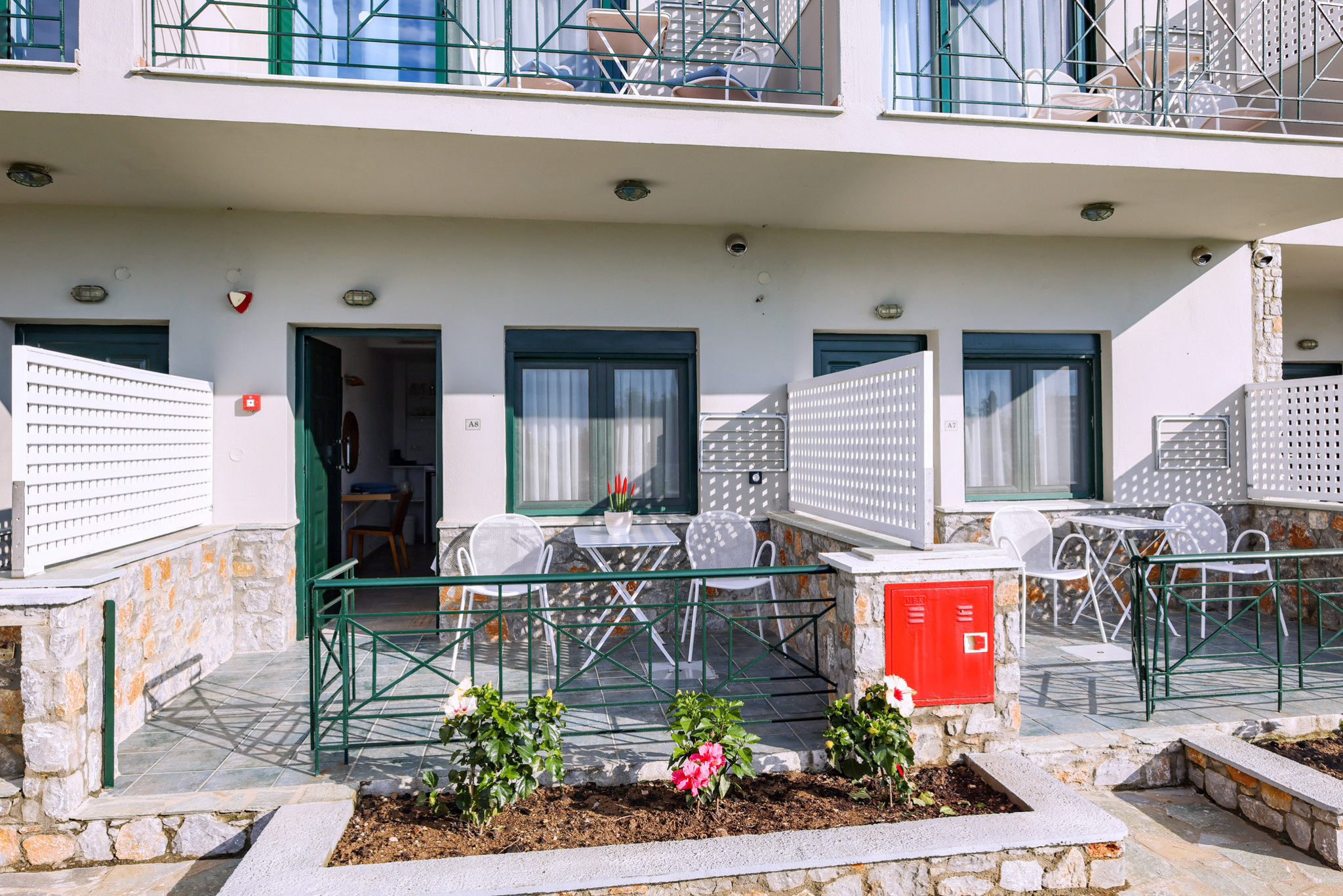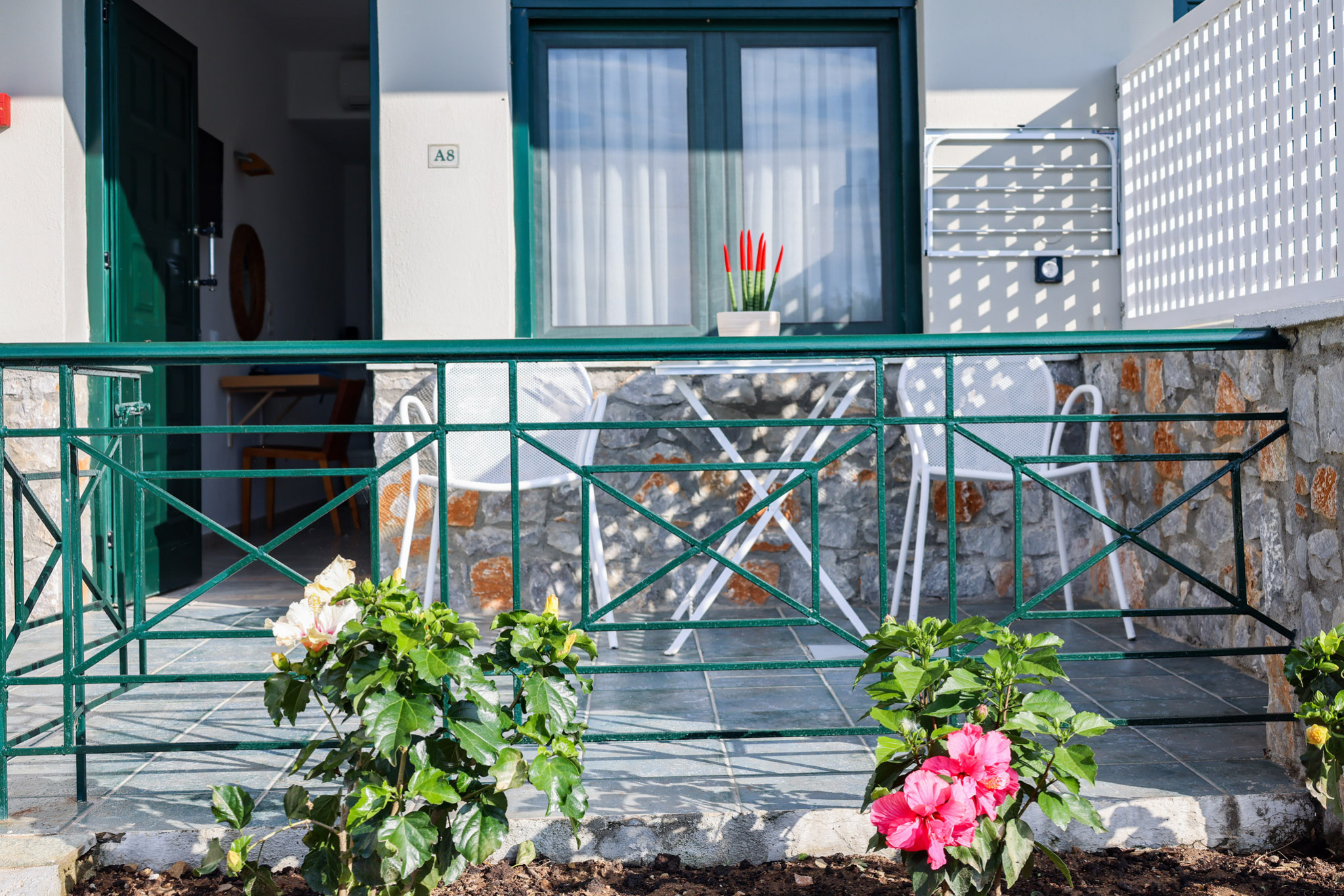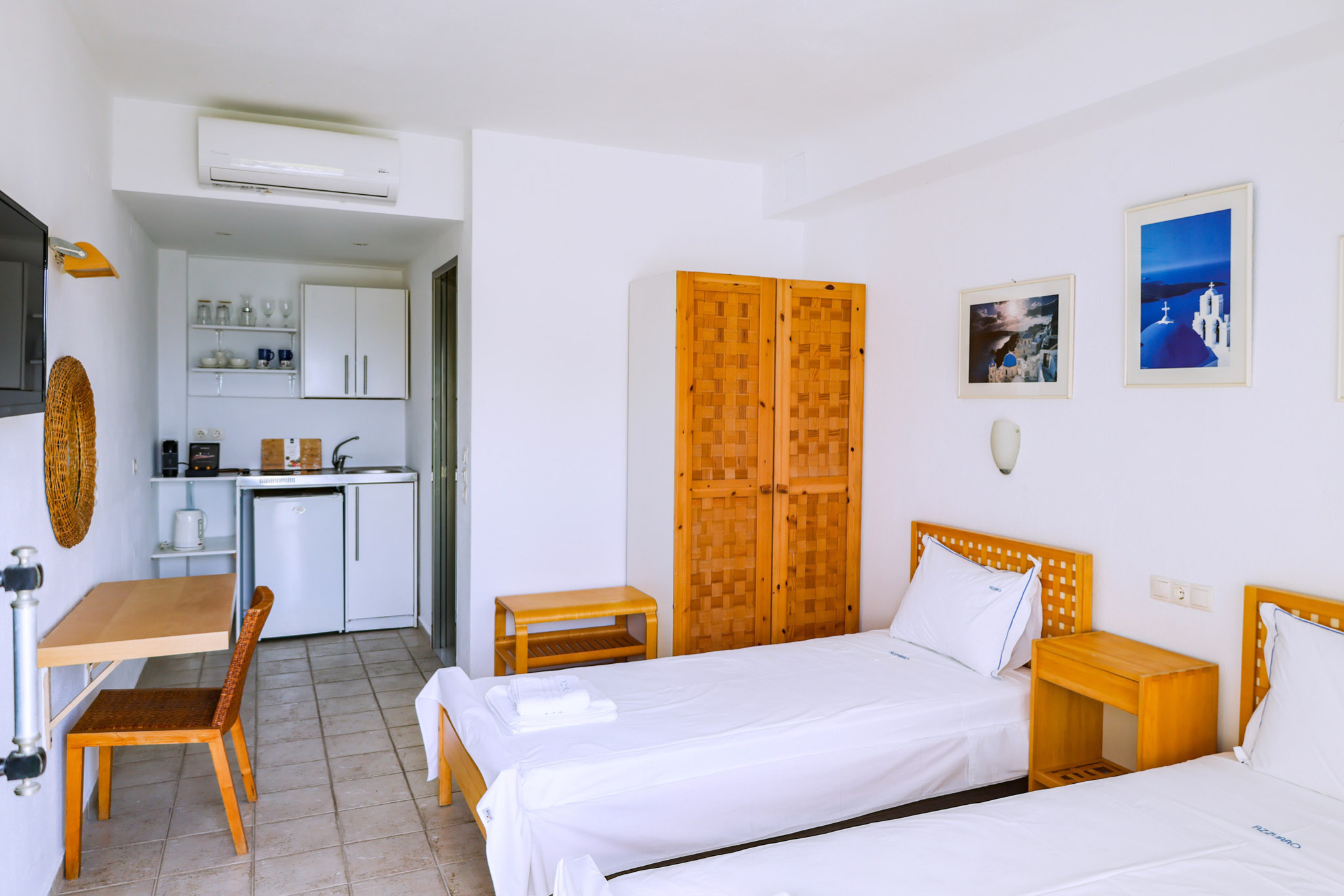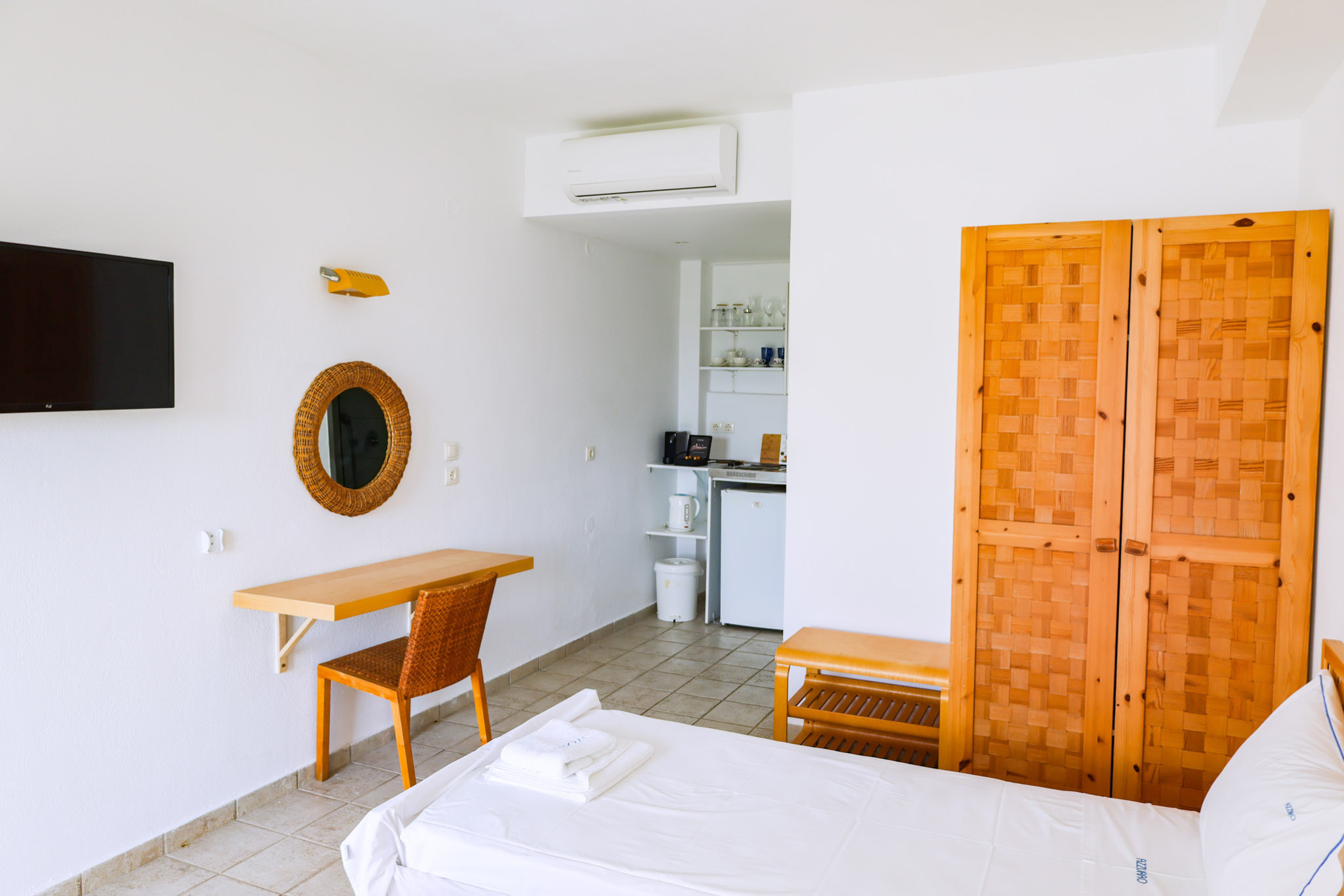 Tastefully decorated with plain wooden furnishings, the Double Room draws you into the ultimate comfort combined with the tranquility of its airy terrace. It offers a cozy double bed (which can turn into two twin beds) next to the window, a serviceable kitchenette, and an ultra-sleek bathroom with embossed white tiles and shower.