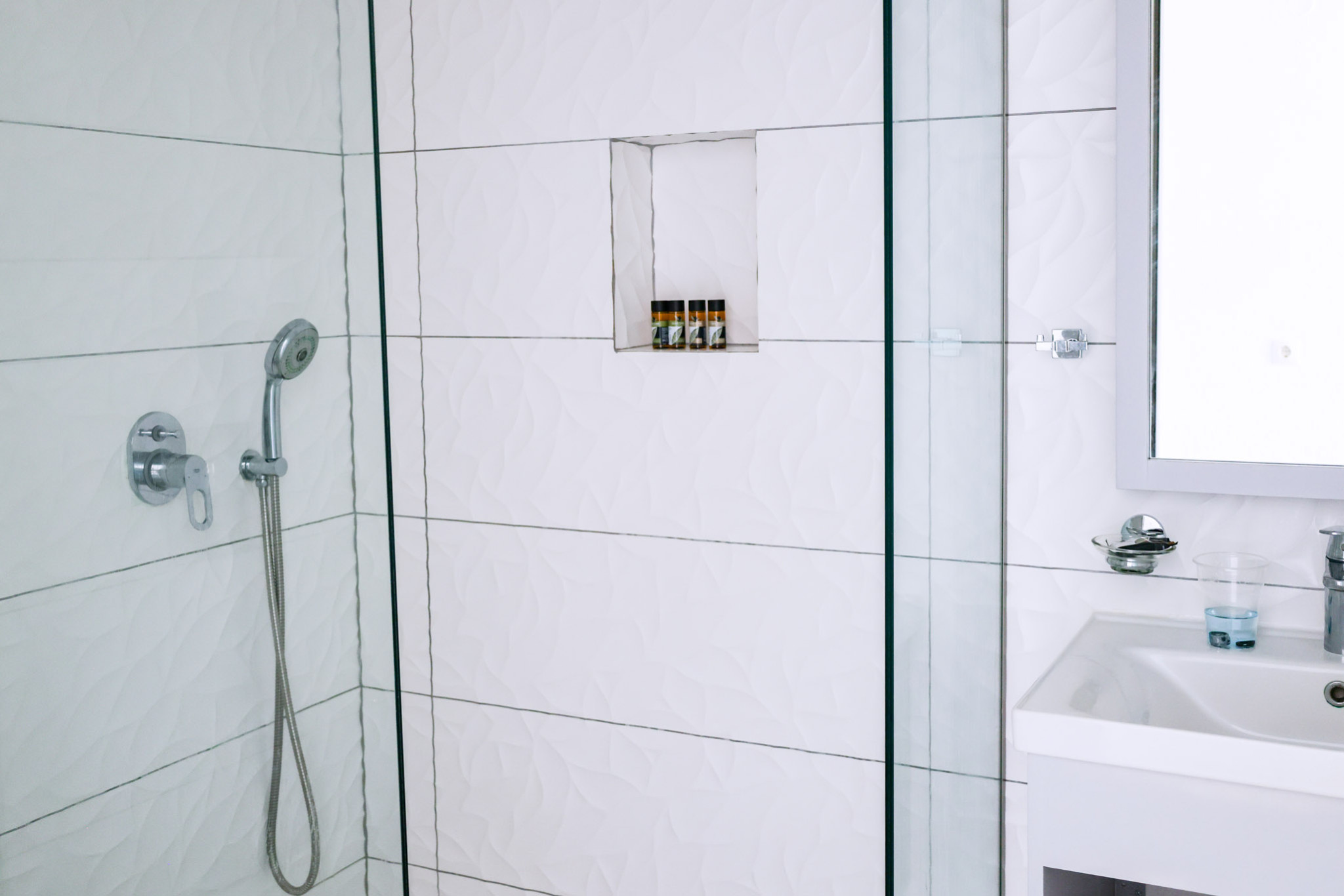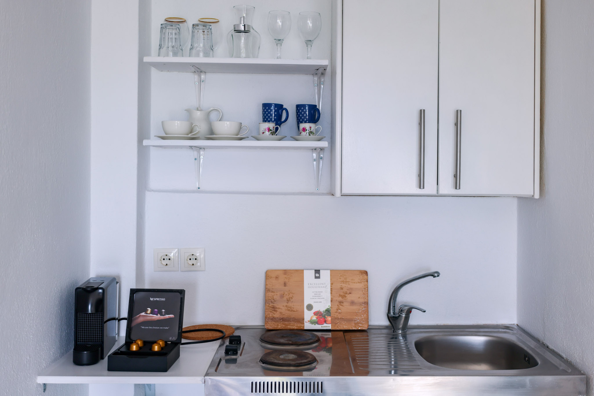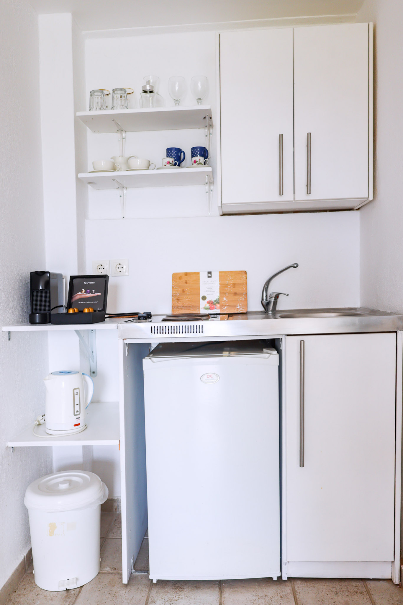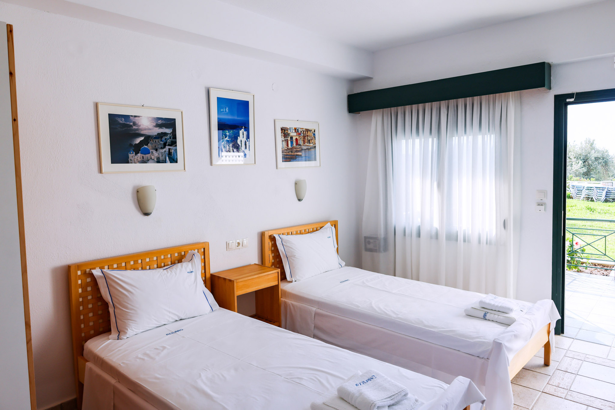 Tastefully decorated with plain wooden furnishings, the Double Room draws you into the ultimate comfort combined with the tranquility of its airy terrace. It offers a cozy double bed (which can turn into two twin beds) next to the window, a serviceable kitchenette, and an ultra-sleek bathroom with embossed white tiles and shower.