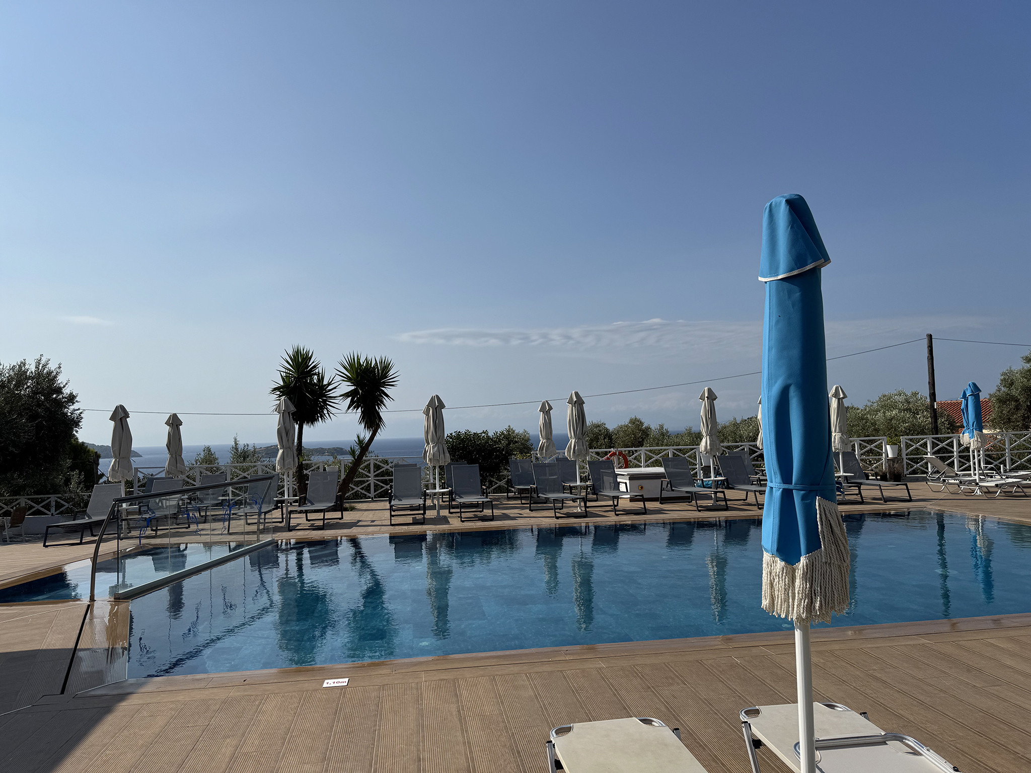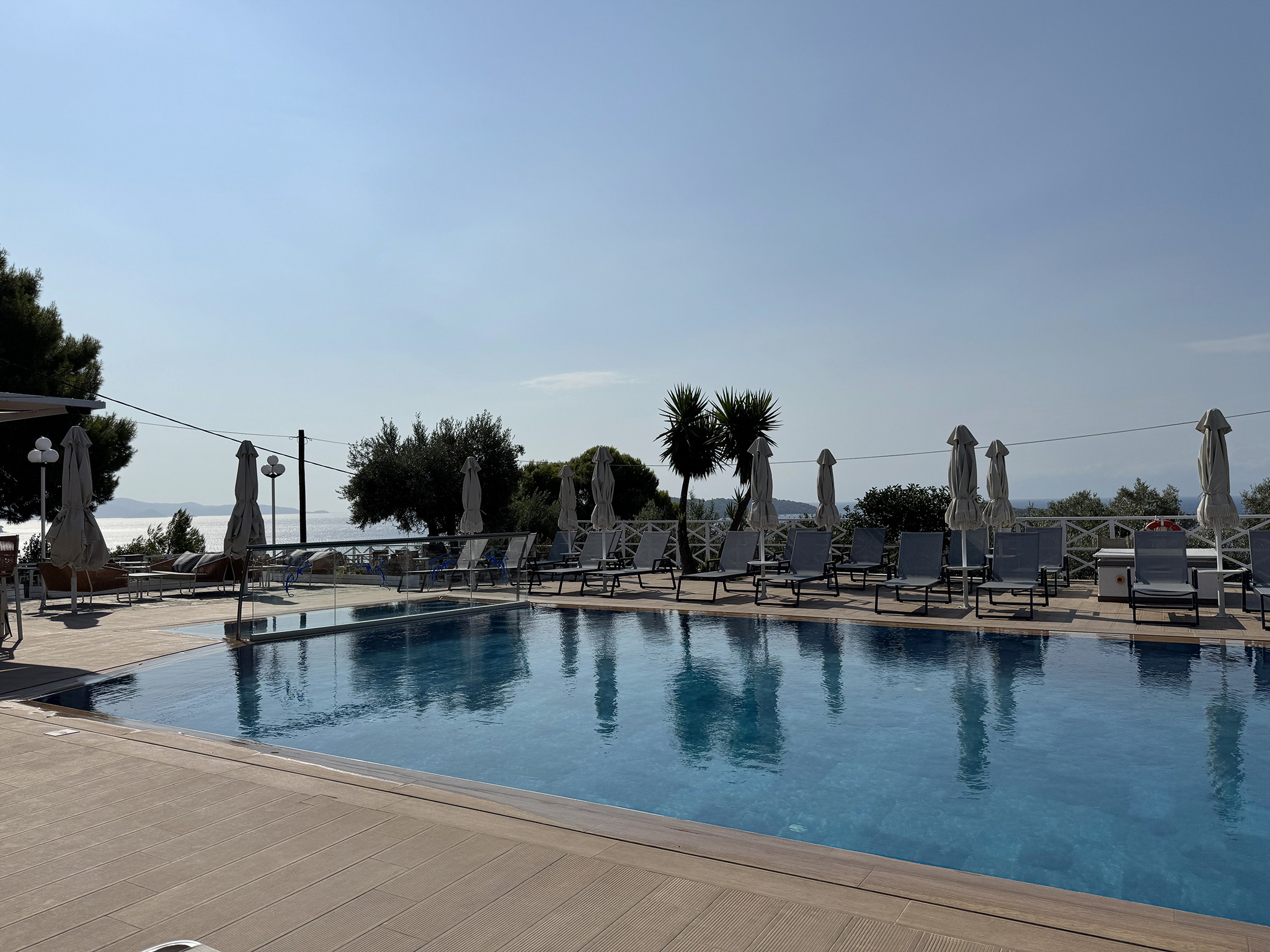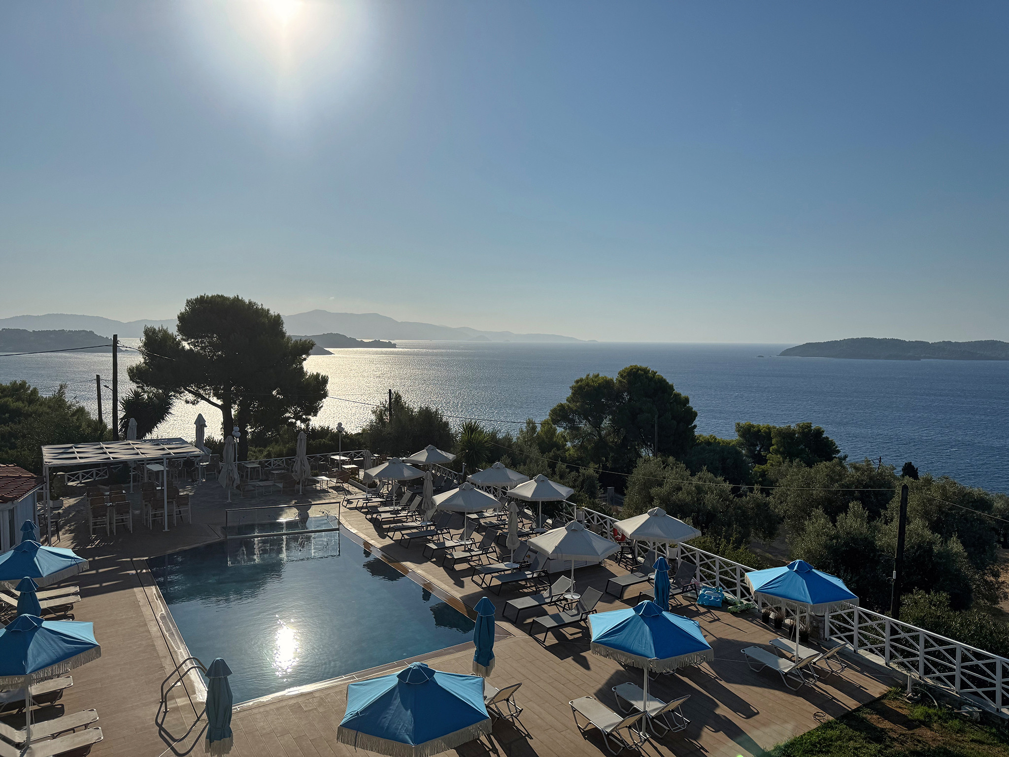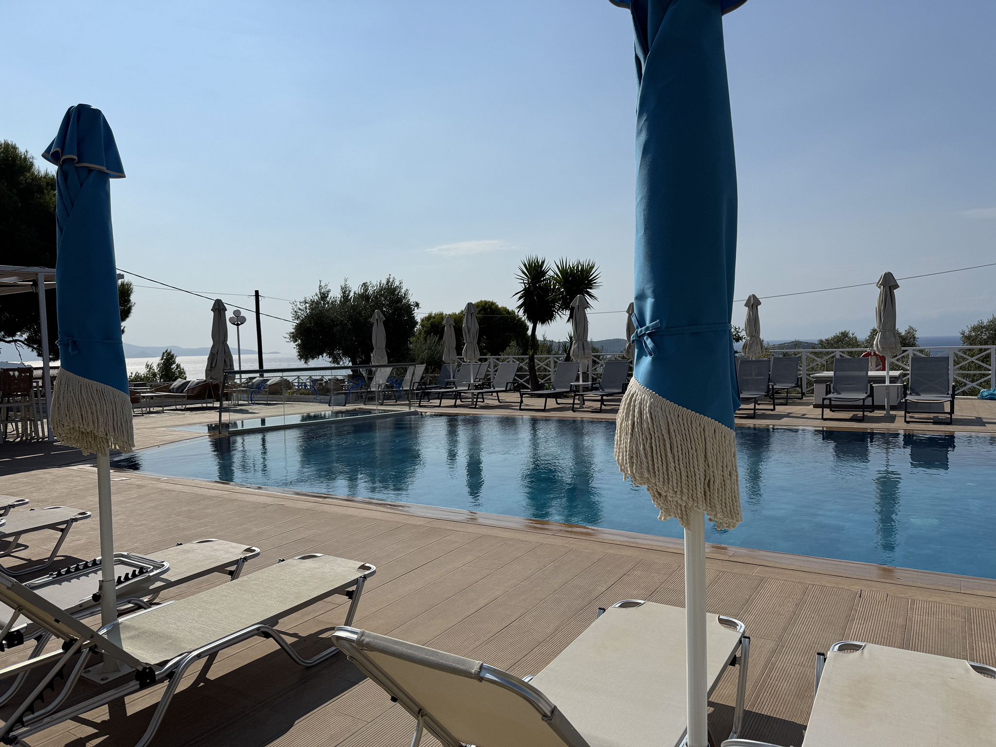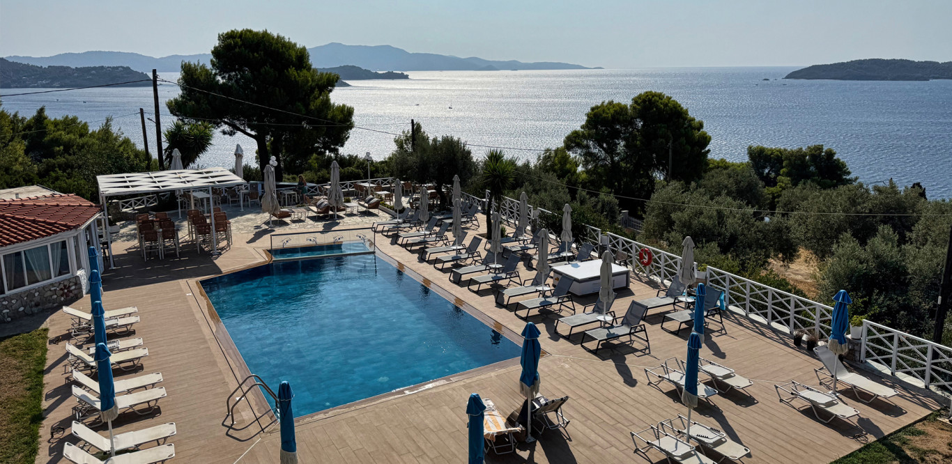 The tempting swimming pool of Azzurro is the starting point for your peaceful vacation in Skiathos. Reflecting on the surrounding natural beauty, the turquoise pool waters join your recharging moments on this colorful island. Relax with some repetitive dives in the energizing water and breathe the fresh air of Skiathos under the clear blue sky. Your eyes will stare at the glowing sea and the breathtaking view of the facing islands Skopelos and Tsougrias, while you surrender your palate to the tasty meals prepared at our dreamy pool bar. For our little guests, there’s a separated shallow area of the pool in order to splash safely.