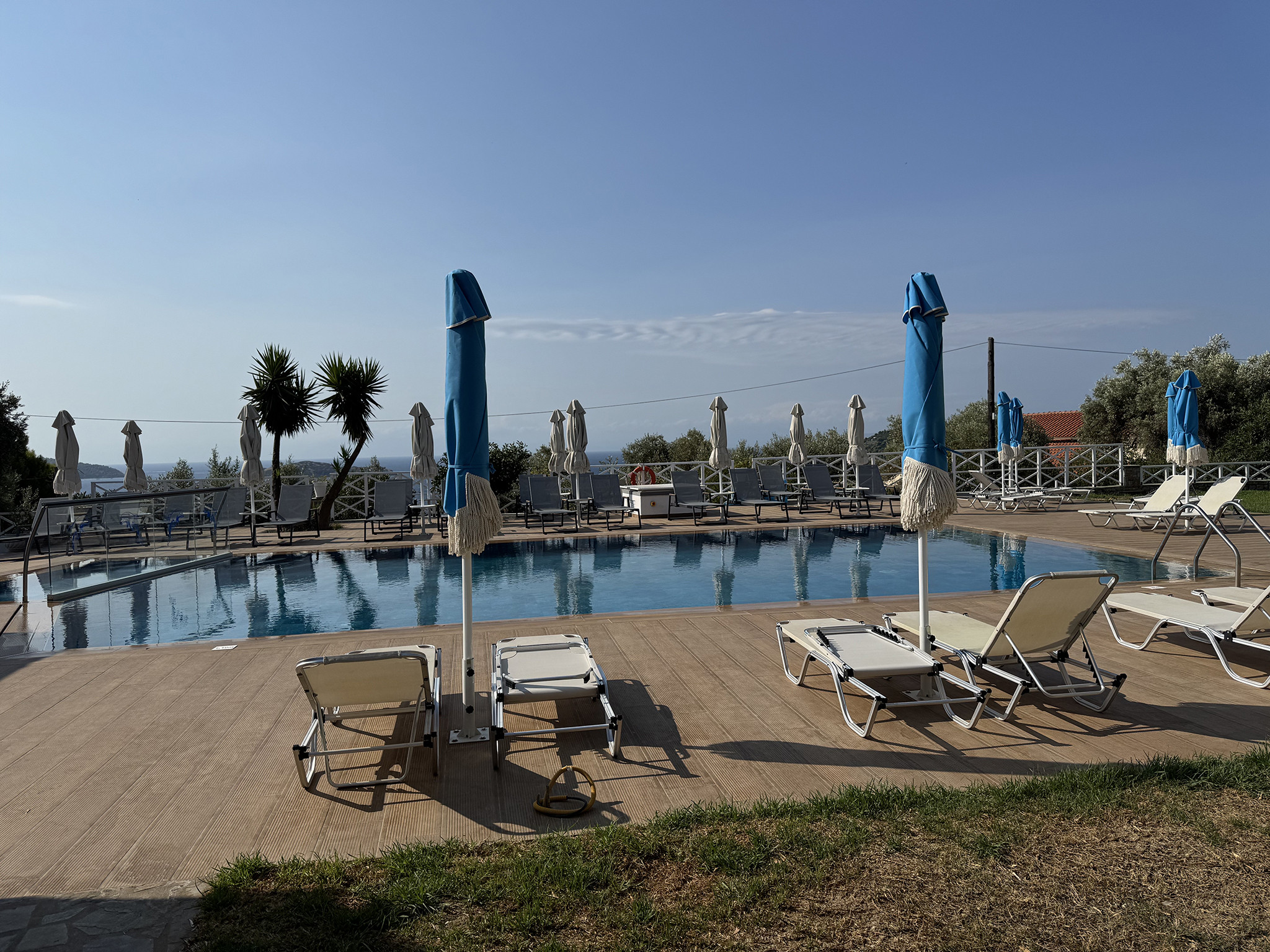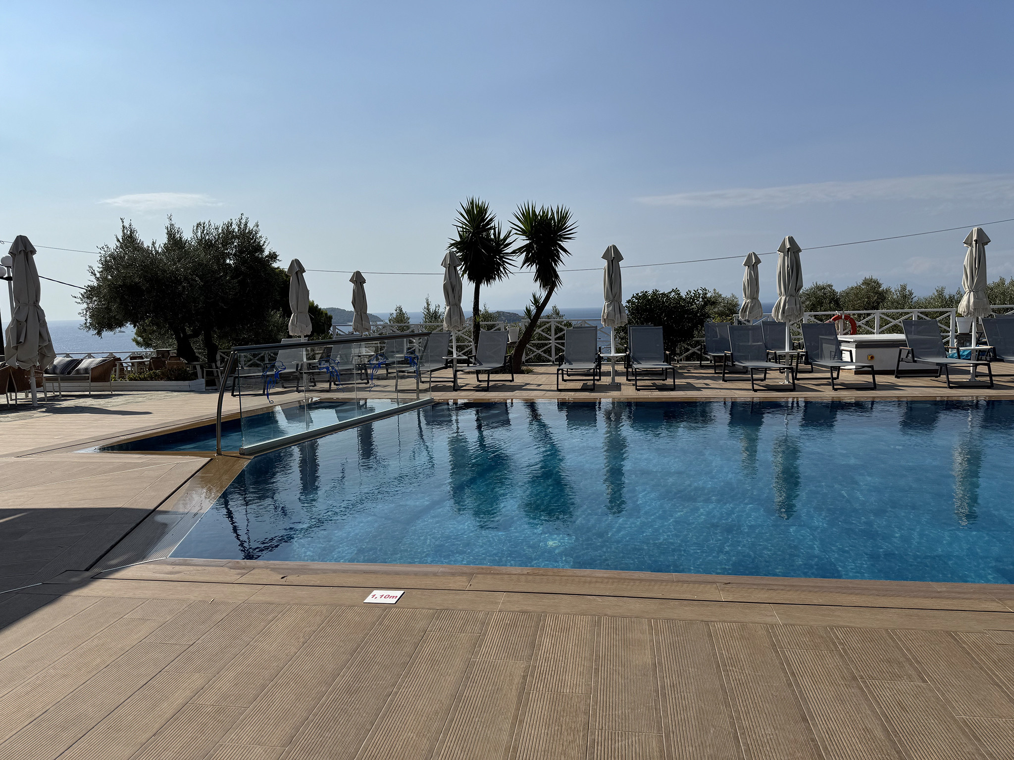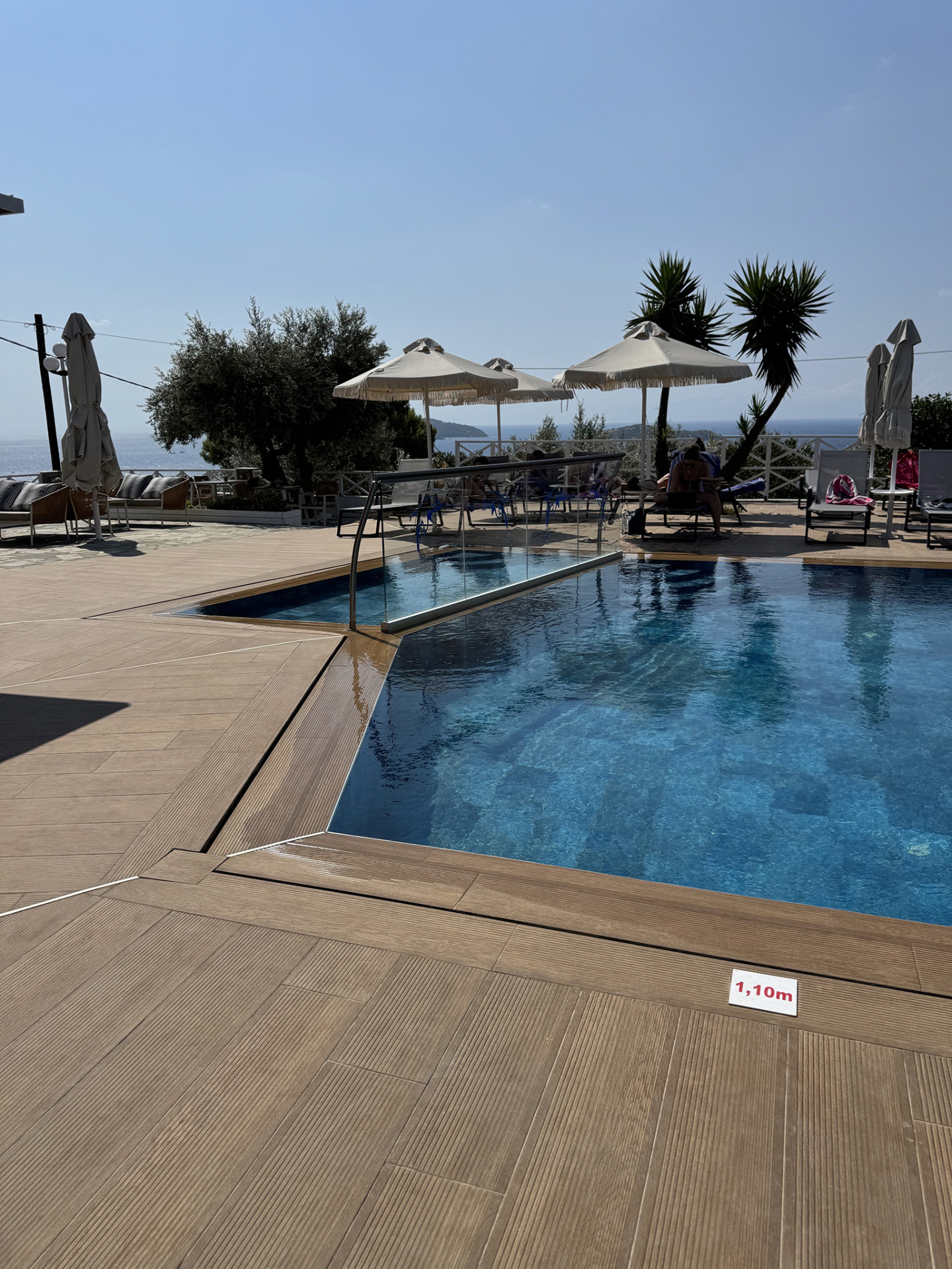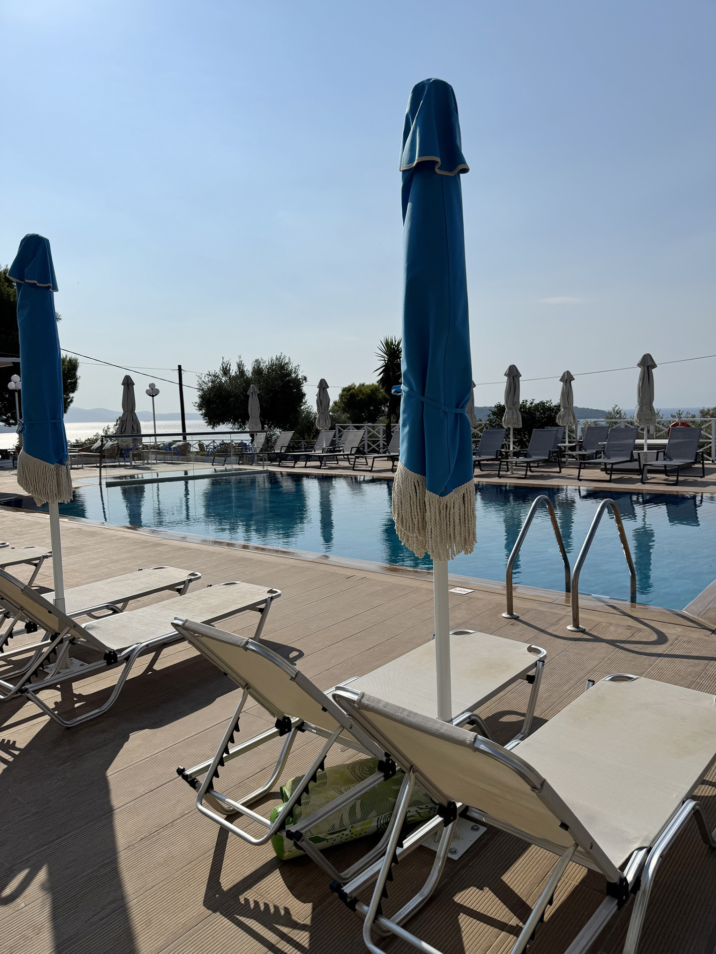 The tempting swimming pool of Azzurro is the starting point for your peaceful vacation in Skiathos. Reflecting on the surrounding natural beauty, the turquoise pool waters join your recharging moments on this colorful island. Relax with some repetitive dives in the energizing water and breathe the fresh air of Skiathos under the clear blue sky. Your eyes will stare at the glowing sea and the breathtaking view of the facing islands Skopelos and Tsougrias, while you surrender your palate to the tasty meals prepared at our dreamy pool bar. For our little guests, there’s a separated shallow area of the pool in order to splash safely.